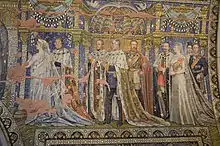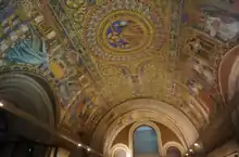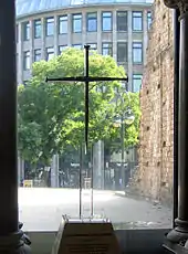 The entrance hall in the base of the damaged spire was reopened to visitors, having been consecrated on 7 January 1987.[2] Its floor contains a mosaic of the Archangel Michael fighting the dragon. The vault shows a procession of Hohenzollern princes and includes a depiction of Crown Prince Wilhelm who never became king after his father, Wilhelm II, abdicated the throne in 1918.[15] Other mosaics show important monarchs in medieval Germany, Reformation thinkers and Reformation princes. Bas-relief sculptures illustrate scenes from biblical stories (Jacob wrestling with the angel, Jesus in the garden of Gethsemane, and the pietà), scenes from the life of Kaiser Wilhelm I and symbolic figures representing war and peace.[16] In the north apse are 16 display panels which tell the story of the old church and its destruction. At the opposite end of the hall are three items which symbolise the history of the church. In the middle is a damaged statue of Christ which originally stood on the altar of the old church. To its right is the Cross of Nails which was made from nails in the roof timbers of Coventry Cathedral, which had been severely damaged in a German air raid on 14 November 1940. To the left of the statue of Christ is an icon cross which was given by the Russian Orthodox Church and handed over in 1988. Outside the hall are four sandstone figures made by Stefan Kaehne.[17]