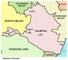 Kalmykia,[lower-alpha 1] officially the Republic of Kalmykia,[lower-alpha 2] is a republic of Russia, located in the North Caucasus region of Southern Russia. The republic is part of the Southern Federal District, and borders Dagestan to the south and Stavropol Krai to the southwest; Volgograd Oblast to the northwest and north and Astrakhan Oblast to the north and east; Rostov Oblast to the west and the Caspian Sea to the east. Kalmykia is the only region in Europe where Buddhism is the predominant religion.[14]
