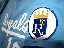 The Royals' home uniform remained almost unchanged from its first season. The original design featured blue arm and neck piping, along with "Royals" in blue and in script lettering. The road uniform was inverted from the home uniform, with "Kansas City" written in blue, in script lettering and in an arch arrangement. For the 1971 season the "Kansas City" on the road uniforms were changed to block lettering, while both uniforms added a roundel containing the team logo on the left sleeve. The blue cap with "KC" stitched in front was also introduced and remains in use today.[1]