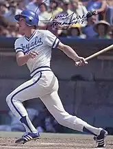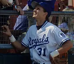 At the end of the 1989 season, the team boasted a powerhouse pitching rotation, including the AL Cy Young Award-winner Bret Saberhagen (who set franchise record 23 wins that year), two-time All-Star Mark Gubicza (a 15-game winner in 1989) and 1989 AL Rookie of the Year runner-up Tom Gordon (who won 17 games that year).[22] But the organization felt it was still missing a few necessary pieces to give its divisional rival Oakland Athletics a run for their money.[23] So prior to the 1990 season, the Royals acquired Mark Davis, the 1989 National League Cy Young Award-winner and league leader in saves, signing him to a 4-year, $13 million contract (the largest annual salary in baseball history at the time).[24] The Royals also signed starting pitcher Storm Davis, who was coming off a career-high 19-game win season (third-best in the AL), to a three-year $6 million contract.[24] Despite the promising off-season moves, the team suffered critical bullpen injuries while both newly signed Davises experienced lackluster seasons in 1990.[23] The Royals concluded the season with a 75–86 record, in second-to-last place in the AL West (and with the worst franchise record since 1970). Bo Jackson—the team's potential future franchise player—suffered a devastating hip injury while playing football in the off-season, so the Royals waived him during spring training in 1991.[25]