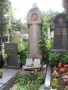 Surprisingly, the Gestapo was not aware of his death. Several months later, just after the German invasion of Czechoslovakia, Nazi agents came to the Čapek family house in Prague to arrest him.[11] Upon discovering that he had already been dead for some time, they arrested and interrogated his wife Olga. She was later released and lived until 1968; she died onstage of a heart attack while performing one of her husband's plays.[36] His brother Josef was arrested in September and eventually died in the Bergen-Belsen concentration camp in April 1945.[37] Karel Čapek and his wife are buried at the Vyšehrad cemetery in Prague. The inscription on the tombstone reads: "Here Josef Čapek, painter and poet, would have been buried. Grave far away."[35]