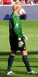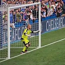 In the first month of the season, Schmeichel was shown a seemingly needless red card in the 79th minute of Leicester's away game to Nottingham Forest on 20 August 2011 after receiving two yellow cards for "unsporting conduct". He received the first card for moving the ball from the penalty spot as Forest's Lewis McGugan was about to take a kick, then received his second for throwing the ball away after the spot kick was successfully converted. After the match, Schmeichel apologized, claiming his back was turned to the referee so did not know he had received the first of the yellow cards. "I didn't know I had been booked as I had my back to the ref otherwise I would never have done that," he said on his personal Twitter page.[62][63] Despite this, Schmeichel's performances for Leicester quickly began earning him plaudits, with his then manager Sven-Göran Eriksson comparing him with England number 1 goalkeeper Joe Hart,[64] and teammate and former England international Paul Konchesky describing him as "one of the best [goalkeepers] he has ever played with".[65] A short-distant reaction save against Portsmouth in November 2011, in particular, earnt Schmeichel praise and was described by Portsmouth manager Michael Appleton as "one of the best saves I have seen in a very long time".[66] and by Leicester manager Nigel Pearson as "a world-class, outstanding save and was very important at that point of the game".[67]