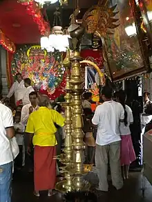 The festivals and daily rituals do not adhere to standard Hindu Agamic or Buddhist rituals. It follows what Paul Younger calls as ancient Vedda traditions of worship. Although since the medieval period Hindus, Buddhists and even Muslims have tried to co-opt the temple, deity and its worship as their own, the rituals maintained by the native priests are still intact.[12] The main festival known in Sinhalese as Esela Perehera. It is celebrated during the months of July and August. About 45 days before the festival begins, the priests go into the forest and find two forked branches of a sacred tree. The branches are then immersed in the local river and kept at the shrines dedicated to Kataragama deviyo and Vali. When the main festival begins, the Yantra representing the deity is retrieved from its storage location, paraded through a street on top of an elephant, and carried to the Valli shrine. After two hours it is returned. On the last day of the festival the Yantra is left overnight at the Valli shrine and brought back to the main shrine. The priests conduct the rituals in silence, covering their mouths with white cloth. Associated with the main festival is fire walking arranged by a master of the ritual. Hundreds of devotees participate in fire walking, yet others participate in ecstatic dance forms called Kavadi and body piercing. Many of the pilgrims exhibit signs of being possessed.[49][50]
