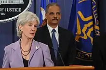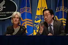 The Senate Finance Committee approved Sebelius' nomination with a vote of 15 to 8.[61] The full United States Senate voted to confirm Sebelius by a vote of 65 to 31.[62] She was sworn in on April 28, 2009,[63] amidst an outbreak of swine flu in the United States.[64] Lieutenant Governor Parkinson was sworn in as Governor of Kansas and served the remainder of Sebelius's term.[65][66][67] As Secretary of Health and Human Services, Sebelius led an agency with 6,500 employees and a $700 billion annual budget.[46]