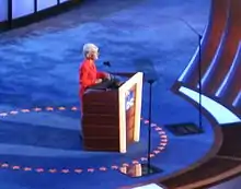 After Barack Obama's clinching of the Democratic nomination for President in June 2008, speculation that Sebelius would be a contender for the vice presidential slot on the Democratic ticket continued.[35] The Washington Post listed her as the top prospect for the 2008 nomination.[36] James Carville and Bob Novak also mentioned Sebelius's name,[37][38] and Wesley Clark, also considered a potential running mate, publicly endorsed Sebelius, referring to her as "the next vice-president of the United States".[39] Speculation that the vice presidential nomination lay in her future was heightened by the fact that she was chosen by the Democratic Party's congressional leaders to give their party's official response to Republican president George W. Bush's 2008 State of the Union Address.[40] The next day, she endorsed Obama's campaign, one week before the Kansas caucus on Super Tuesday.[41] Obama won the caucus easily, with 74% support.[42]