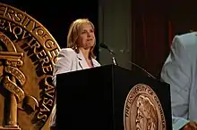 In a media crossover to animated film, Couric was the voice of news-reporter "Katie Current" in the US version of the film Shark Tale. She has also made cameo appearances in Austin Powers in Goldmember (as a Georgia State Prison guard) and an episode of General Hospital (as a journalist pretending to be a doctor: a storyline she helped create).[68][69] She guest-starred as herself on the CBS sitcom Murphy Brown in 1992 and in the NBC sitcom Will & Grace in late 2002, and made a cameo appearance on a Pawn Stars episode.[70] On May 12, 2003, she traded places for a day with Tonight Show host Jay Leno. Couric also co-hosted NBC's live coverage of Macy's Thanksgiving Day Parade from 1991 until 2005. She received the Golden Plate Award of the American Academy of Achievement in 2005.[71][72] Couric delivered the graduation speech at her alma mater University of Virginia on May 20, 2012, at Randolph-Macon College on June 1, 2013, and at Princeton University on June 1, 2009.[73][74][75] She also works with Carmen Marc Valvo to help publicize the deadliness, yet preventability, of colorectal cancer. On May 16, 2010, Couric received an honorary doctor of science degree for her efforts in raising awareness of colorectal cancer and for her commitment to advancing medical research from Case Western Reserve University, and later gave the university's 2010 convocation keynote address.[76] In 2016, she starred as herself in Sully to recreate the 60 Minutes interview for the film.
