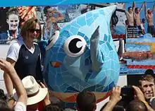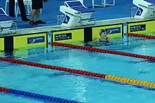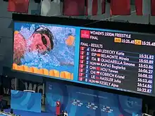 At the 2012 Summer Olympics in London, Ledecky qualified to swim in the final of the 800-meter freestyle by placing third overall in the heats with a time of 8:23.84.[32] In the final, Ledecky stunned the field, winning gold by more than four seconds, with a time of 8:14.63, the then second-fastest effort of all time just behind Rebecca Adlington's world record of 8:14.10 set in 2008.[33] In addition, she broke Janet Evans' American record of 8:16.22 that had stood since 1989. In the final, Ledecky went out hard and, by the 200-meter mark, she had already established an almost body-length lead. Her 400-meter split was 4:04.34, a personal best for Ledecky in that distance, and would have placed fifth in the individual 400-meter freestyle. At the 750-meter mark, Ledecky was 3.42 seconds ahead of Mireia Belmonte García, and 0.31 seconds under world record pace. Ledecky won by 4.13 seconds and just missed the world record by 0.53 seconds. Her gold was the first international medal of her career, earning her the 2012 Best Female Performance of the Year and Breakout Performer of the Year at the Golden Goggle Awards.