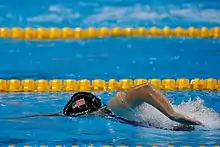 On the meet's final day, Ledecky set her fifth world record of the year, lowering her record in the 1500-meter freestyle by nearly six seconds with a time of 15:28.36. Ledecky swam the second half of the race faster than the first, completing the final 800 meters in 8:14.11—faster than any other woman has completed a regular 800-meter race in a textile suit.[45] Ledecky lapped three competitors in the final and finished 27.33 seconds ahead of silver medalist Boyle. National Team Director Frank Busch described Ledecky's 1500 performance as "the most impressive race I have ever seen, and I've been in the sport for 50 years.... She's blazing a completely different trail than anyone who has come before."[21]
