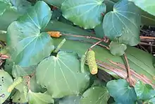 Kawakawa (Piper excelsum) plant, known also as "Māori kava", may be confused with kava. While the two plants look similar and have similar names, they are different but related species. Kawakawa is a small tree endemic to New Zealand, having importance to traditional medicine and Māori culture. As noted by the Kava Society of New Zealand, "in all likelihood, the kava plant was known to the first settlers of Aotearoa [New Zealand]. It is also possible that (just like the Polynesian migrants that settled in Hawaii) the Maori explorers brought some kava with them. Unfortunately, most of New Zealand is simply too cold for growing kava and hence the Maori settlers lost their connection to the sacred plant."[31] Further, "in New Zealand, where the climate is too cold for kava, the Maori gave the name kawa-kawa to another Piperaceae M. excelsum, in memory of the kava plants they undoubtedly brought with them and unsuccessfully attempted to cultivate. The Maori word kawa also means "ceremonial protocol", recalling the stylized consumption of the drug typical of Polynesian societies".[7] Kawakawa is commonly used in Maori traditional medicine for the treatment of skin infections, wounds and cuts, and (when prepared as a tea) for stomach upsets and other minor illnesses.[32]