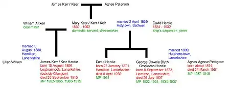 Hardie's younger half-brothers David Hardie, George Hardie and sister-in-law Agnes Hardie all became Labour Party Members of Parliament after his death. His daughter Nan Hardie and her husband Emrys Hughes both became Provost of Cumnock; Hughes also became Labour Member of Parliament for South Ayrshire in 1946.