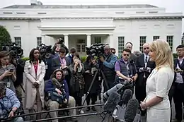 Conway came under criticism when she was photographed sitting on an Oval Office couch with her legs folded beneath her – shoes pressed against the upholstery – during President Trump's meeting with leaders from historically black colleges and universities.[121][122] Some observers suggested the sitting position was a sign of disrespect and a lack of decorum.[123] Body language expert Patti Wood asserted that Conway's posture was not only rude, but "rather sexual", and a sign that she "doesn't have to follow the rules" because she was "buddies with Trump."[124] Conway later addressed the controversy with Lou Dobbs, saying that she was asked to take photographs of the meeting from a certain angle and that she certainly meant "no disrespect." She also blamed the media for the ensuing furor.[125][123]