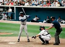 On April 3, 1989, in his very first MLB plate appearance, Griffey hit a line-drive double off Oakland Athletics pitcher Dave Stewart at the Oakland Coliseum.[21] One week later in his first at-bat at the Kingdome, Griffey hit his first major league home run.[22] Griffey was a frequent participant in the All-Star Game during the 1990s. He led his league multiple times in different hitting categories.[13]