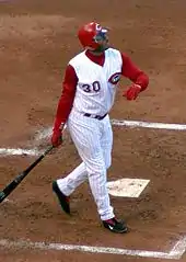 In 2000, Griffey changed his number from 24 to 30, the number his father wore while playing in both Cincinnati and Seattle; the number 24 was already retired in honor of Tony Pérez. The 2000 season began what has generally been seen by the media as a decline in Griffey's superstar status. Although his statistics during this season were respectable, they were far below his previous level of play: in 145 games, Griffey hit .271 with 40 home runs and 118 runs batted in, but his .942 on-base plus slugging was his lowest mark in five years.[12] Additionally, from 2001 through 2004, Griffey was plagued by a string of injuries, including season-ending injuries in 2002, 2003, and 2004.[38] Worse yet for Griffey, the cumulative effects of the injuries lowered his bat speed,[39] resulting in less power and fewer home runs (he slugged only .426 before succumbing to injury in 2002, his lowest output in seven years). Injuries forced Griffey to miss 260 out of 486 games from 2002 through 2004, diminishing both his skills and his star reputation.