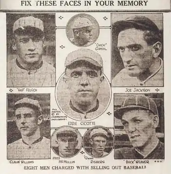 The issue of the 1919 Series came to the public eye again in September 1920, when, after allegations that a game between the Chicago Cubs and Philadelphia Phillies on August 31 had been fixed, a grand jury was empaneled in state court in Chicago to investigate baseball gambling. Additional news came from Philadelphia, where gambler Billy Maharg stated that he had worked with former boxer Abe Attell and New York gambler Arnold Rothstein to get the White Sox to throw the 1919 Series. Cicotte and Jackson were called before the grand jury, where they gave statements incriminating themselves and six teammates: Williams, first baseman Chick Gandil, shortstop Swede Risberg, third baseman Buck Weaver, center fielder Happy Felsch and reserve infielder Fred McMullin. Williams and Felsch were also called before the grand jury and incriminated themselves and their teammates.[87] Through late September, the 1920 American League season had been one of the most exciting on record, with the White Sox, Cleveland Indians and New York Yankees dueling for the league lead. By September 28, the Yankees were close to elimination, but the White Sox and Indians were within percentage points of each other. On that day, however, the eight players, seven of whom were still on the White Sox, were indicted. They were immediately suspended by White Sox owner Charles Comiskey.[88] The Indians were able to pull ahead and win the pennant, taking the American League championship by two games over Chicago.[89]