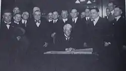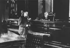 Even with the armistice in November 1918, the war-related trials continued. The Socialist Party of America, like the IWW, had opposed the war, and had also been raided by federal authorities. Seven Socialist Party leaders, including Victor Berger, who was elected to Congress in November 1918, were indicted for alleged anti-war activities.[65] The defendants were charged under the Espionage Act of 1917, which made it illegal "to utter, print, write, or publish any disloyal, profane, scurrilous or abusive language" about the armed forces, the flag, the Constitution, or democracy.[67] The defendants, who were mostly of German birth or descent, moved for a change of venue away from Landis's courtroom, alleging that Landis had stated on November 1, 1918, that "[i]f anybody has said anything about the Germans that is worse than I have said, I would like to hear it so I could use it myself."[68] Landis, however, examined the transcript of the trial in which the statement was supposedly made, failed to find it, declared the affidavit in support of the motion "perjurious", and denied the motion.[69] While the jury was being selected, Berger was indicted on additional espionage charges for supposedly violating the law during an earlier, unsuccessful political campaign.[69] At the conclusion of the case, Landis took an hour to dramatically charge the jury, emphasizing the secretive nature of conspiracies and pointing at the jury box as he noted, "the country was then at war".[70] At one point, Landis leapt out of his seat, twirled his chair around, then sat on its arm. Later in his charge, he lay prone upon the bench.[70] The jury took less than a day to convict Congressman-elect Berger and his four remaining codefendants.[71] Landis sentenced each defendant to twenty years in federal prison.[72] Landis denied the defendants bail pending appeal, but they quickly obtained it from an appellate court judge.[73] The Seventh Circuit Court of Appeals declined to rule on the case itself, sending it on to the Supreme Court, which on January 31, 1921, overturned the convictions and sentences by a 6–3 vote, holding that Landis should have stepped aside once he was satisfied that the affidavit was legally sufficient, leaving it for another judge to decide whether it was actually true.[74] Landis refused to comment on the Supreme Court's decision, which ordered a new trial. In 1922, the charges against the defendants were dropped by the government.[75]