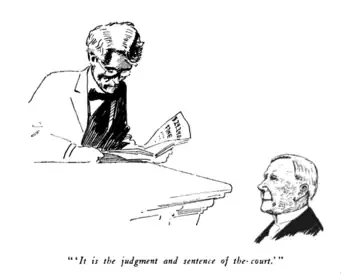 If Judge Landis was suspicious of an attorney's line of questioning, he would begin to wrinkle his nose, and once told a witness, "Now let's stop fooling around and tell exactly what did happen, without reciting your life's history."[25] When an elderly defendant told him that he would not be able to live to complete a five-year sentence, Landis scowled at him and asked, "Well, you can try, can't you?"[26] When a young man stood before him for sentencing after admitting to stealing jewels from a parcel, the defendant's wife stood near him, infant daughter in her arms, and Landis mused what to do about the situation. After a dramatic pause, Landis ordered the young man to take his wife and daughter and go home with them, expressing his unwillingness to have the girl be the daughter of a convict. According to sportswriter Ed Fitzgerald in SPORT magazine, "[w]omen wept unashamed and the entire courtroom burst into spontaneous, prolonged applause."[27]