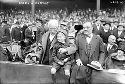 In early 1917, Landis considered leaving the bench and returning to private practice—though he greatly enjoyed being a judge, the salary of $7,500 was considerably lower than what he could make as an attorney. The entry of the United States into World War I in April ended Landis's determination to resign; a firm supporter of the war effort, he felt he could best serve the country by remaining on the bench.[50] Despite this decision and his age, fifty, Landis wrote to Secretary of War Newton D. Baker, asking him to take him into the service and send him to France, where the war was raging. Baker urged Landis to make speeches in support of the war instead, which he did.[51] The judge's son, Reed, had already served briefly in the Illinois National Guard; during the war he became a pilot, and eventually an ace.[45][52]
