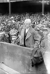 On November 8, the owners of the eight National League and three American League teams which supported the Lasker Plan met and unanimously selected Landis as head of the proposed commission. The American League clubs that supported the plan threatened to move to the National League, away from Johnson, who opposed it. Johnson had hoped that the minor leagues would support his position; when they did not, he and the "Loyal Five" teams agreed to the Lasker Plan.[94] In the discussions among the owners that followed, they decided that Landis would be the only commissioner–no associate members would be elected.[95] On November 12, the team owners came to Landis's courtroom to approach him. Landis was trying a bribery case; when he heard noise in the back of the courtroom from the owners, he gaveled them to silence.[96] He made them wait 45 minutes while he completed his docket, then met with them in his chambers.[97][98]