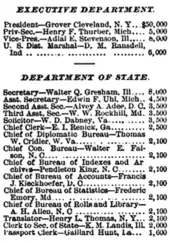 In March 1893, President Grover Cleveland appointed federal judge Walter Q. Gresham as his Secretary of State, and Gresham hired Landis as his personal secretary. Gresham had a long career as a political appointee in the latter part of the 19th century; though he lost his only two bids for elective office, he served in three Cabinet positions and was twice a dark horse candidate for the Republican presidential nomination. Although Gresham was a Republican, he had supported Cleveland (a Democrat) in the 1892 election because of his intense dislike for the Republican nominee, President Benjamin Harrison.[12] Kenesaw Landis had appeared before Judge Gresham in court. According to Landis biographer J. G. Taylor Spink, Gresham thought Landis "had something on the ball" and believed that Landis's shorthand skills would be of use.[13]