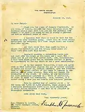 In Washington, Landis worked hard to protect Gresham's interests in the State Department, making friends with many members of the press. He was less popular among many of the Department's senior career officials, who saw him as brash. When word leaked concerning President Cleveland's Hawaiian policy, the President was convinced Landis was the source of the information and demanded his dismissal. Gresham defended Landis, stating that Cleveland would have to fire both of them, and the President relented, later finding out that he was mistaken in accusing Landis.[14] President Cleveland grew to like Landis, and when Gresham died in 1895, offered Landis the post of United States Ambassador to Venezuela. Landis declined the diplomatic post, preferring to return to Chicago to begin a law practice[15] and to marry Winifred Reed, daughter of the Ottawa, Illinois postmaster. The two married July 25, 1895; they had two surviving children, a boy, Reed, and a girl, Susanne—a third child, Winifred, died almost immediately after being born.[16]