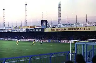 Renovation of Kenilworth Road was neglected for the next two decades—financial difficulties and the club's ambitions to build a new ground meant that regeneration was unaffordable, and would also prove unnecessary should relocation occur. However, following the rejection of several potential sites for a new ground, the club finally turned their attentions back to the maintenance of Kenilworth Road.[6] The first real modernisation of the ground came in 1973, with the first addition of seats at the stadium since the construction of the new Main Stand in 1922. The Bobbers Stand became all-seated, while the rest of the ground remained terracing.[9] The new look stand could hold only 1,539 seats, and as a result the capacity of the ground dropped to 22,601.[6]