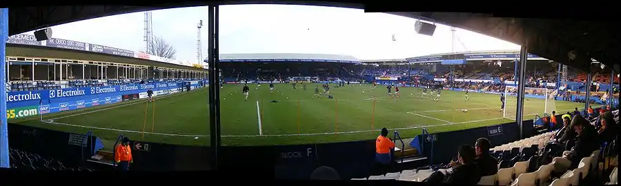 The ground has undergone several major changes since its original construction in 1905. The original Main Stand, boasting a press loft and a balcony above the roof, burnt down in 1921,[6] and was replaced by the current stand before the 1922–23 campaign. The new Main Stand was split into two: the upper tier contained wooden seats, so there was a ban on smoking in the stand; the lower tier, which became known as the Enclosure, was terracing.[8][9]