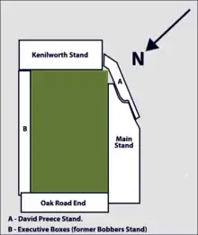 The ground is made up of five stands—opposite the eponymous Kenilworth Stand is the Oak Road End, and to the left is the Main Stand, which is flanked to its right by the David Preece Stand. Opposite them stand a row of executive boxes.
