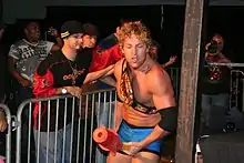 On November 1, 2008, Omega appeared for Pro Wrestling Guerrilla (PWG) during the 2008 Battle of Los Angeles, where he was defeated in the first round of the tournament by local talent Brandon Bonham.[54] The next night, during a three-way tag team match in which Omega competed, he was Irish whipped into the ropes by Davey Richards, only for the force to snap the middle and bottom ropes, throwing Omega out of the ring.[55] Three months later, Omega returned to the promotion at Express Written Consent, where he was defeated by El Generico after referee Rick Knox hit him with a leaping clothesline after Knox grew tired of Omega abusing him.[56][57] At PWG's hundredth show on April 12, 2009, he lost to Bryan Danielson.[58]