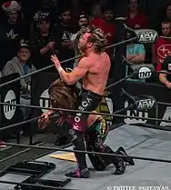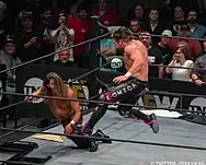 Omega signed a four-year contract with All Elite Wrestling (AEW) on February 7, 2019.[148] He serves as an executive vice president of the promotion as well as one of its in-ring talents.[149] He competed at the promotion's inaugural event, Double or Nothing, where he lost to Chris Jericho in the main event, after which both men were attacked by Jon Moxley.[150] A scheduled match between Omega and Moxley for the All Out pay-per-view did not take place due to Moxley suffering an MRSA infection.[151] Omega instead competed against Pac at All Out, where he was defeated.[152][153] On the premiere episode of Dynamite on October 2, Omega was taken out by a returning Moxley during a six-man tag team match, with Omega's team later losing the contest.[154] In the main event of Full Gear on November 9, Omega lost to Moxley in an unsanctioned Lights Out match.[155][156]