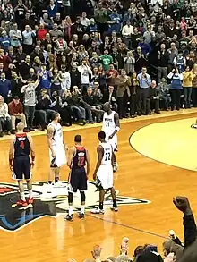 On July 11, 2015, Garnett re-signed with the Timberwolves to a two-year deal.[83][84] On November 15, 2015, against the Memphis Grizzlies, Garnett became the fifth player in NBA history to play at least 50,000 minutes, joining Kareem Abdul-Jabbar, Karl Malone, Jason Kidd, and Elvin Hayes.[85] On December 1, against the Orlando Magic, Garnett surpassed Kidd (50,110) for third on the NBA's career minutes list.[86] Four days later, in a loss to the Portland Trail Blazers, he became the 15th player in NBA history to surpass 26,000 career points.[87] On December 11, Garnett passed Malone as the NBA's all-time leader in defensive rebounds during Minnesota's 111–108 overtime loss to the Denver Nuggets. He finished the game with four defensive boards to give him 11,409 for his career, three ahead of Malone.[88] Garnett appeared in 38 of the team's first 45 games of the season before missing the entire second half of the season with a right knee injury, the same knee that kept him out of 25 games in 2008–09 when he was playing for Boston, as well as much of his post-trade time in Minnesota during the 2014–15 season.[89]