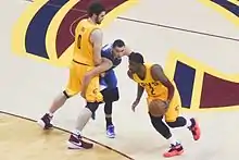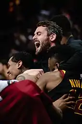 The Cavaliers finished the regular season as the first seed in the Eastern Conference with a 57–25 record. In the first round of the playoffs, the Cavaliers faced the eighth-seeded Detroit Pistons, and in a Game 1 win on April 17, Love recorded playoff career highs with 28 points and 13 rebounds.[106] Love helped the Cavaliers advance through to the Eastern Conference Finals where they faced the Toronto Raptors. He struggled in Games 3 and 4 of the series, scoring just 15 total points, before bouncing back in Games 5 and 6 to help the Cavaliers defeat the Raptors 4–2.[107] The win advanced them through to the NBA Finals, where they faced the defending champion Golden State Warriors. Love's struggles in the NBA Finals were well documented. After recording 17 points and 13 rebounds in a Game 1 loss, a concussion suffered in Game 2 forced him to miss Game 3. His return in Game 4 saw him come off the bench to score 11 points, but with a 108–97 loss, the Cavaliers fell behind 3–1 in the series. Game 5 saw Love return to the starting line-up, but despite playing 33 minutes, he managed just two points as the Cavaliers forced a Game 6 with a 112–97 win. Game 6 also saw Love struggle, but the Cavaliers managed a 115–101 win to force a Game 7. The Cavaliers won Games 5 and 6 with Love contributing just nine total points on 2-of-8 shooting.[108] With the series tied a 3–3, Love managed 9 points and 14 rebounds in Game 7 to help the Cavaliers win the series 4–3, as they became the first team to rally from a 3–1 finals deficit, beating the Warriors 93–89 in Game 7 to end a 52-year major sports championship drought in Cleveland.[109]