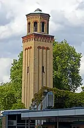 The Palm House was originally heated by two coal-fired boilers, with a 107 feet (33 m) chimney, the "Shaft of the Great Palm-Stove", now known as the Campanile, near the Victoria Gate. Coal was brought in by a light railway, running in a tunnel, using human-propelled wagons. The tunnel acted as a flue between the boilers and the chimney, but the distance proved too great for efficient working, and so two small chimneys were added to the Palm House. In 1950 the railway was electrified. The tunnel is now used to carry piped hot water to the Palm House, from oil-fired boilers located near the original chimney, which is extant, and is Grade II listed.[53]