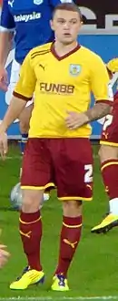 In July 2011, Trippier joined Championship club Burnley on a season-long loan as a replacement for the departing Tyrone Mears.[24] He made his debut for the Clarets in August 2011, a 2–2 home draw with Watford.[25] His first goal for the club came in September 2011, with a superb long-range free-kick against Milton Keynes Dons in a 2–1 win in the League Cup.[26] His first league goal came in December 2011, a 1–0 win over Brighton & Hove Albion at the Falmer Stadium, with a powerful shot from the edge of the box.[27] In December 2011, after impressing during his loan, Trippier was nominated for the Championship Player of the Month award.[28] On 2 January 2012, he received his first professional red card for picking up two bookings in a 2–1 defeat to Leeds United.[29] A day later, Burnley signed Trippier on a permanent deal for an undisclosed fee, signing a three-and-a-half-year contract.[30] In January 2012 he scored his second goal for the club, scoring from range in a 2–0 win away to Middlesbrough.[31] In March 2012, he scored the first in a 5–1 rout against Portsmouth at Fratton Park.[32] He played in all 46 league games in his first season as the club finished in mid-table, going on to win the Burnley Player of the Year award.[33]