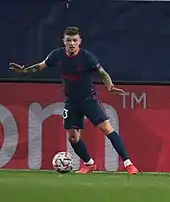 Trippier signed for La Liga club Atlético Madrid on 17 July 2019 on a three-year contract, for a fee of £20 million plus add-ons.[61][62] He became Atlético's first English player in 95 years.[63] In his debut on 18 August in their opening La Liga match against Getafe, he helped the team to a 1–0 home win by providing an assist for Álvaro Morata's goal.[64] In December 2020, Trippier was given a 10-week worldwide football ban and fined £70,000 for four breaches of Football Association betting rules after he allegedly passed on information on his transfer to his friends who then placed bets on his transfer.[65][66] The ban was suspended by FIFA, which dismissed its appeal, until the case is decided by the Court of Arbitration for Sport (CAS).[67][68] CAS rejected the appeal,[69] and Trippier sat out his ban until his return to the team for the Madrid derby against Real Madrid on 7 March 2021,[70] which ended in a 1–1 draw.[71]