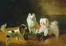 The breeds of toy spaniel often rivalled the Pug in popularity as lapdogs for ladies. The disadvantage of the breeds of toy spaniel was that their long coats required constant grooming.[22] By 1830, the toy spaniel had changed somewhat from the dogs of Charles II's day. William Youatt in his 1845 study, The Dog, was not enamoured of the changes: "The King Charles's breed of the present day is materially altered for the worse. The muzzle is almost as short, and the forehead as ugly and prominent as the veriest bull-dog. The eye is increased to double its former size, and has an expression of stupidity with which the character of the dog too accurately corresponds." Youatt did concede that the breed's long ears, coat and colouring were attractive.[25] Due to the fashion of the period, the toy spaniels were crossed with Pugs to reduce the size of their noses and then selectively bred to reduce it further. By doing this, the dog's sense of smell was impaired, and according to 19th century writers, this caused the varieties of toy spaniel to be removed from participation in field sports.[23] Blunt-Lytton proposed that the red and white Blenheim Spaniels always had the shorter nose now seen in the modern King Charles.[3]