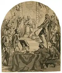 Cardinal Pandolf arrives from Pope Innocent III bearing a formal accusation. As the latest salvo of the Investiture Controversy, King John is blocking the Pope's chosen Archbishop, Stephen Langton, from the Diocese of Canterbury and has further imposed Caesaropapism upon the Catholic Church in England. John defies the Holy See and vows that "No Italian priest shall tithe or toll in our dominions", whereupon the Cardinal declares him excommunicated and deposed as King. Pandolf demands that the French king renounce the new treaty, though Philip is hesitant, having just established familial ties to King John. Cardinal Pandolf points out that Philip's links to the Vatican are older and firmer.