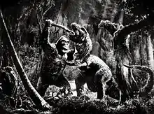 King Kong producer Ernest B. Schoedsack had earlier monkey experience directing Chang: A Drama of the Wilderness (1927), also with Merian C. Cooper, and Rango (1931), both of which prominently featured monkeys in authentic jungle settings. Capitalizing on this trend, Congo Pictures released the hoax documentary Ingagi (1930), advertising the film as "an authentic incontestable celluloid document showing the sacrifice of a living woman to mammoth gorillas." Ingagi is now often recognized as a racial exploitation film as it implicitly depicted black women having sex with gorillas, and baby offspring that looked more ape than human.[11] The film was an immediate hit, and by some estimates, it was one of the highest-grossing films of the 1930s at over $4 million. Although Cooper never listed Ingagi among his influences for King Kong, it has long been held that RKO greenlighted Kong because of the bottom-line example of Ingagi and the formula that "gorillas plus sexy women in peril equals enormous profits."[12]