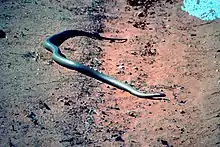 The king brown snake accounted for 4% of identified snakebite attacks in Australia between 2005 and 2015, with no deaths recorded.[41] The last recorded death occurred in 1969,[42] when a 20-year-old man was bitten while reaching around for a packet of cigarettes under his bed in Three Springs, Western Australia. The man was treated over two days, with twice daily injections of death adder, brown snake and tiger snake antivenin, yet died in 37 hours despite this medical attention. This incident led to the introduction of Papuan black snake antivenom for treatment of king brown snake envenomation.[43] Before this it had been confirmed in one fatality and suspected in another in the early 1960s.[44] Venomous snakes normally only bite humans when disturbed. King brown snakes have been noted, however, to bite people who were asleep at the time.[42][45] Furthermore, a significant number of victims have been snake handlers. These have resulted in a high proportion of bites occurring on upper limbs.[42] The king brown snake is classified as a snake of medical importance by the World Health Organization.[46][lower-alpha 1]
