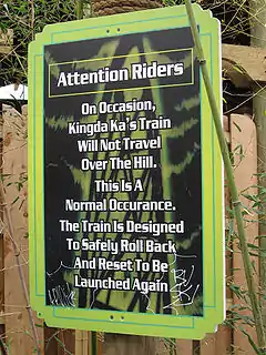 A train may occasionally experience a rollback following a launch. A rollback occurs when the train fails to make it over the top of the tower and descends back down the side it was launched. Kingda Ka includes retractable magnetic brakes on its launch track to prevent a train from rolling back all the way into the loading station (and potentially colliding with the next about-to-be-launched train).[34]