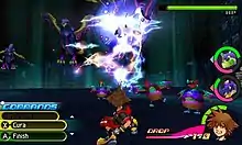 The game, which largely follows the action RPG and hack and slash gameplay of previous games in the series, sees players alternate between the roles of Sora and Riku, which is done via the 'Drop' system. During gameplay, a Drop Gauge gradually depletes over time, though it can be replenished with items. When the gauge completely empties, control will switch to the other character, though players may also opt to drop manually at any time. Drop Points, which are earned by defeating enemies and completing optional objectives, can be spent on bonuses that can be used until the next time the character drops, such as a slower Drop Gauge or increased attack or defense.[1] The game reuses the Command Deck system from Birth by Sleep, in which players can customize a deck filled with various actions, spells, and items that can be quickly selected. There are also several new elements added to the gameplay. Flowmotion allows players to move quickly about by performing actions such as bouncing off walls, grinding on rails and spinning around poles.[2] Reality Shift is a system the player can use on certain objects or weakened opponents. It involves a touch-screen activated minigame unique to each world, which includes dragging the screen to fling a target like a catapult, touching hidden words to take control of enemies, and playing a rhythm-based minigame to cause fireworks to appear.[3][4]