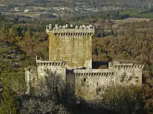 Each bishopric was divided into a number of territories or counties, named terras, condados, mandationes, commissos, or territorios in local charters,[48] which in the north were true continuations of the Suebic dioceses which frequently preserved old tribal divisions and denominations, such as Lemabos, Celticos, Postamarcos, Bregantinos, and Cavarcos. Rights to the tax collection and government of each territory was granted by the titular ruler—usually the king—to a count, bishopric, or large monastery, although there existed some singularities. The bishopric of Lugo was divided into counties, each one under the government of an infanzon (a lesser nobleman) as a concession of the bishop, while in the south, large and mighty territories such as the Portucalense became hereditary, passed down to the descendants of the 9th century's conquerors. In the Terra de Santiago (Land of Saint James, the fief of the bishops of Iria-Compostela) each territory was administered by a bishop's vicar, while justice was administered by a council composed of representatives of the local churchmen, knights, and peasants.[49]