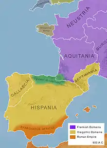 The territorial and administrative organization inherited from the Suevi was incorporated into the new Provincial status,[27] although Lugo was reduced again to the category of bishopric, and subjected to Braga.[28] Meanwhile, the Suevi, Roman, and Galician cultural, religious, and aristocratic elite accepted new monarchs. The peasants maintained a collective formed mostly by freemen and serfs of Celtic, Roman and Suebi extraction, as no major Visigoth immigration occurred during the 6th and 7th centuries.[29]