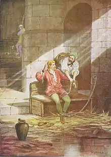 Gruffudd escaped imprisonment in Chester and slew Robert of Rhuddlan in a beachside battle at Deganwy on 3 July 1093.[113] Gruffudd recovered Gwynedd by 1095, and by 1098 Gruffudd allied with Cadwgan ap Bleddyn of the Mathrafal house of Powys, their traditional dynastic rivalry notwithstanding. Gruffudd and Cadwgan led the Welsh resistance to the Norman occupation in the north and mid-Wales. However, by 1098 Earl Hugh of Chester and Hugh of Montgomery, 2nd Earl of Shrewsbury advanced their army to the Menai Strait, with Gruffudd and Cadwgan regrouping on defensible Anglesey, where they planned to make retaliatory strikes from their island fortress. Gruffudd hired a Norse fleet from a settlement in Ireland to patrol the Menai and prevent the Norman army from crossing; however, the Normans were able to pay off the fleet to instead ferry them to Môn. Betrayed, Gruffudd and Cadwgan were forced to flee to Ireland in a skiff.[110][111]