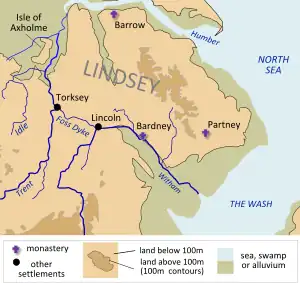 Lindsey lay between the Humber estuary and the Wash, forming its inland boundaries from the courses of the Witham and Trent rivers, and the Foss Dyke between them. A marshy region south of the Humber known as the Isle of Axholme was also included. It is believed that Roman Lindum (Lincoln) was the capital of Lindsey: the continuity of the place name suggests continuity of settlement traditions: in 625, Bede recounts,[3] the missionary Paulinus of York was received by the praefectus of Lindum.[4] Place-name evidence indicates that the Anglian settlement known as Lindisfaras spread from the Humber coast.