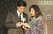 Her work in the biotechnology sector has earned her numerous national awards, including the Padma Shri (1989) and the Padma Bhushan (2005) from the government of India.[48][84] She was given the Economic Times Award for 'Businesswoman of the Year' in 2004.[88] At the Pharmaleaders Pharmaceutical Leadership Summit she was named "Global Indian Woman of the Year" (2012);[89][90] she also received the Express Pharmaceutical Leadership Summit Award for "Dynamic Entrepreneur" in 2009.[48] The Indian Merchants' Chamber Diamond Jubilee Endowment Trust's Eminent Businessperson of the Year Award was presented to Kiran Mazumdar-Shaw in 2006 by the Governor of Maharashtra, S. M. Krishna.[91] She has also received the Indian Chamber of Commerce Lifetime Achievement Award (2005),[92] the 'Corporate Leadership Award' by the American India Foundation (2005).[93][94] and the Karnataka Rajyotsava Award (2002).[48][95] She was honoured with the H.K. Firodia Lifetime Achievement Award 2022 for her contributions to science and technology (2022).[96]