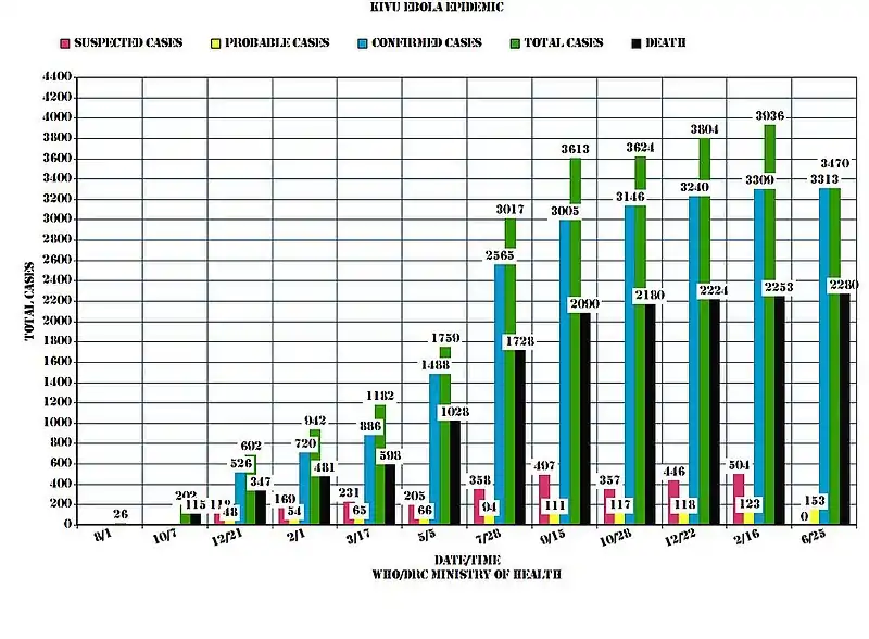 As indicated below and per numbers offered by the United Nations the final death toll was 2,280 with a total of 3,470 cases in DRC in almost a two-year period. This was made very difficult due to the ongoing military attacks in the region which created a perfect storm for the virus, despite there being a vaccine.[38] rVSV-ZEBOV or Ebola Zaire vaccine live, is a vaccine that prevents Ebola caused by the Zaire ebolavirus.[39] The graph of reported cases reflects cases that were not able to have a laboratory test sample before burial as probable cases.[40]