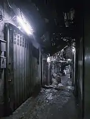 A partial recreation of Kowloon Walled City existed in the Warehouse Kawasaki, an amusement arcade that operated from 2009 to 2019 in the Japanese suburb of Kawasaki, Kanagawa. The atmosphere of the walled city was reflected in the arcade's narrow corridors, electrical wires, pipes, postboxes, sign boards, neon lights, frayed posters, and various other small touches.[88]