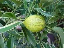 The round kumquat, Marumi kumquat, or Morgani kumquat (retaining the name Citrus japonica or Fortunella japonica when kumquats are divided into multiple species) is an evergreen tree that produces edible golden-yellow fruit.[3] The fruit is small and usually spherical but can be oval-shaped. The peel has a sweet flavor, but the fruit has a distinctly sour center. The fruit can be eaten cooked but is mainly used to make marmalades, jellies, and other spreads. The tree can be used in bonsai cultivation. The plant symbolizes good luck in China, where it is often kept as a houseplant and given as a gift during the Lunar New Year in China. Round kumquats are more commonly cultivated than other species due to their high cold tolerance.[3]