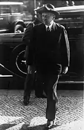 On 16 April, Groener received an angry letter from Hindenburg demanding to know why the Reichsbanner, the paramilitary wing of the Social Democrats had not also been banned. This was especially the case as Hindenburg said he had solid evidence that the Reichsbanner was planning a coup. The same letter from the president was leaked and appeared that day in all the right-wing German newspapers. Groener discovered that Eugen Ott, a close protégé of Schleicher, had made the Social Democratic putsch allegations to Hindenburg and leaked the President's letter.[51] British historian John Wheeler-Bennett wrote that the evidence for an intended SPD putsch was "flimsy" at best, and this was just Schleicher's way of discrediting Groener in Hindenburg's eyes.[52] Groener's friends told him that it was impossible that Ott would fabricate allegations of that sort or leak the President's letter on his own, and that he should sack Schleicher at once. Groener refused to believe that his old friend had turned on him and refused to fire Schleicher.[53]