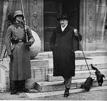 In foreign policy, Schleicher's main interest was in winning Gleichberechtigung ("equality of status") at the World Disarmament Conference, which would do away with Part V of the Treaty of Versailles that had disarmed Germany.[86] Schleicher made a point of cultivating the French ambassador André François-Poncet and stressing his concern with improving Franco-German relations.[87] This was in part because Schleicher wanted to ensure French acceptance of Gleichberechtigung in order to allow Germany to rearm without fear of a French "preventative war." He also believed that improving Berlin-Paris relations would lead the French to abrogate the Franco-Polish alliance of 1921, which would allow Germany to partition Poland with the Soviet Union without having to go to war with France.[87] In a speech before a group of German journalists on 13 January 1933, Schleicher proclaimed that based on the acceptance "in principle" of Gleichberechtigung by the other powers at the World Disarmament Conference in December 1932, he planned to have by no later than the spring of 1934 a return to conscription and for Germany to have all the weapons forbidden by Versailles.[86]